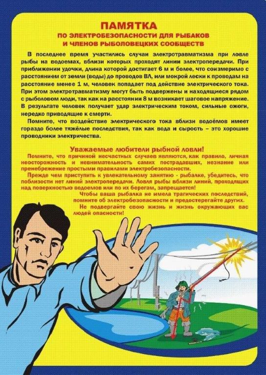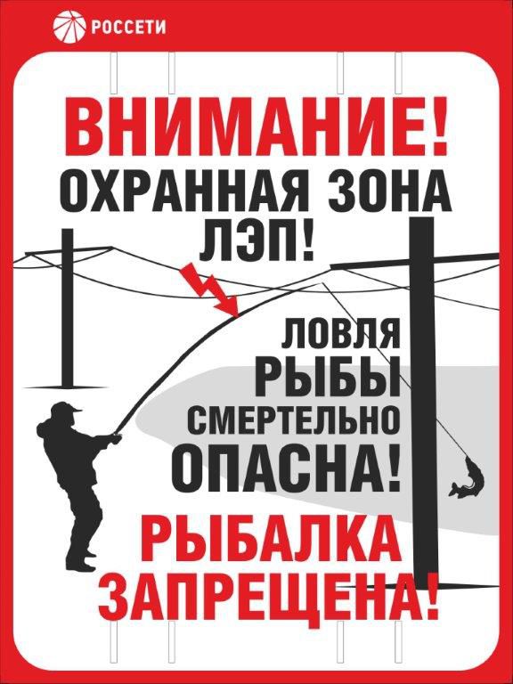 Выбирайте для рыбалки места вдали от воздушных линий электропередачи, трансформаторных подстанций и других энергообъектов. Ловить рыбу в охранной зоне ЛЭП смертельно опасно! Прежде чем приступить к ловле рыбы, осмотритесь по сторонам. Обращайте внимание на информационные таблички и знаки безопасности, размещенные на энергообъектах: «Не влезай, убьет!», «Охранная зона ЛЭП», «Ловля рыбы вблизи ЛЭП смертельно опасна!»
