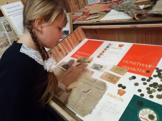 Просмотрев презентацию, дети отправились в школьный музей и увидели старинные червонцы и денежные знаки 1991 года.